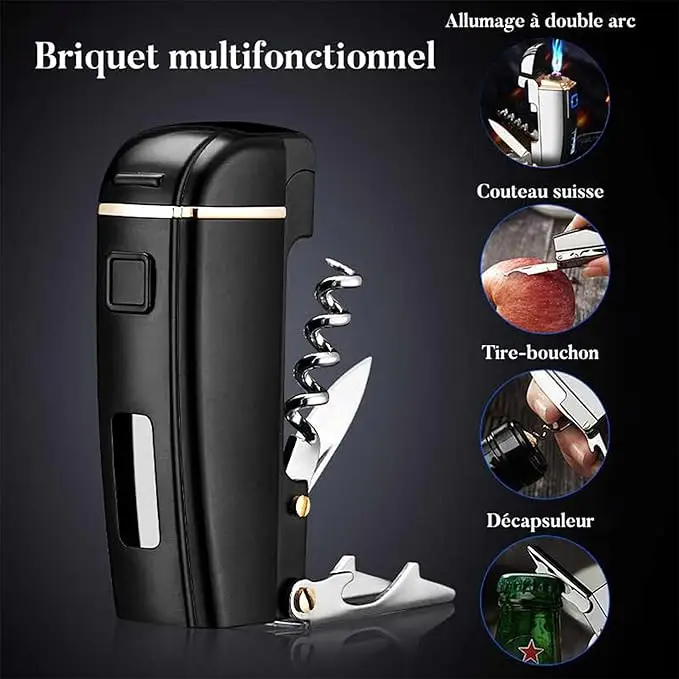 Meilleur Cadeau Saint-Valentin Homme & Femme – Briquet Électrique Rechargeable USB 4-en-1 : Double Arc, Couteau Suisse, Décapsuleur & Ouvre-Bouteille – Cadeau Original et Utile